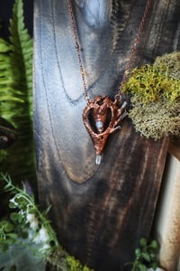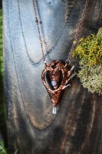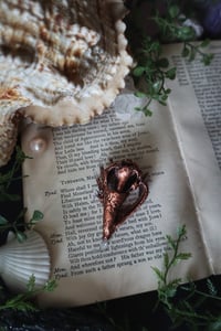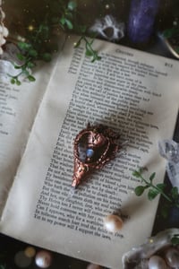 This piece features a stunning conch shell that just so happened to be sliced perfectly. Adorned with a stunning rainbow moonstone and small quartz crystal points. This piece can be worn either way, to show off the natural spiral pattern of the shell, or the glowing moonstone.