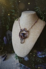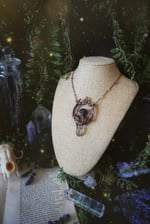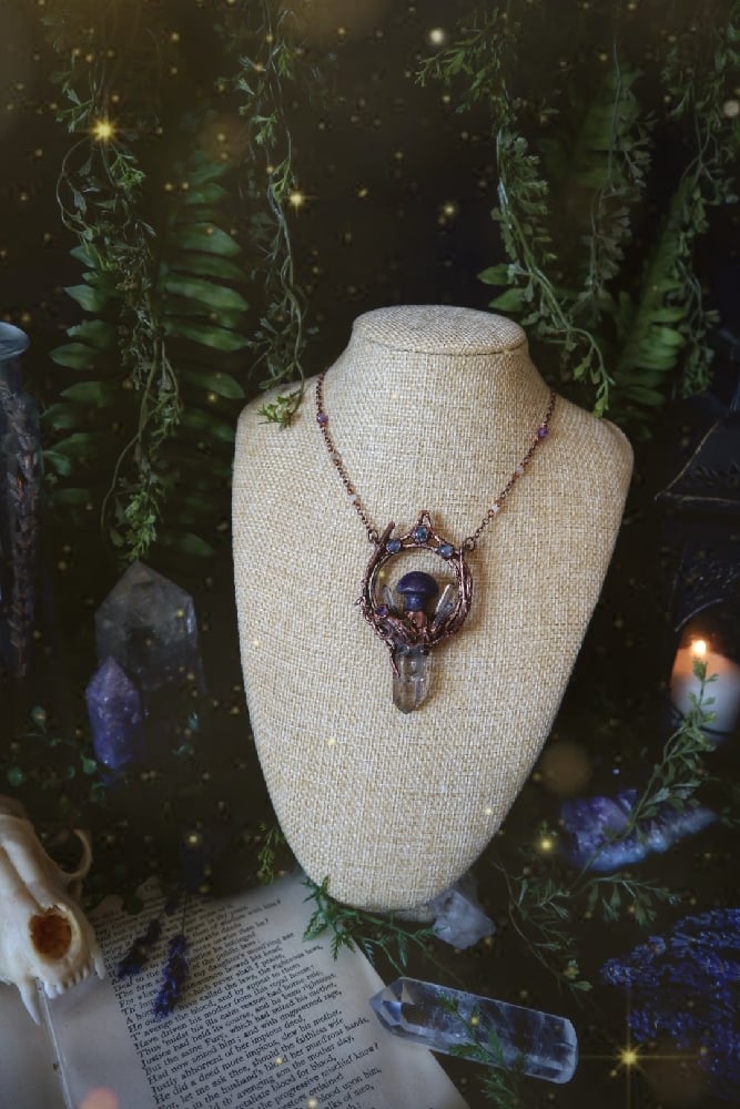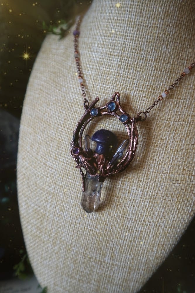 Featuring a stunning smoky quartz point from Montana, topped with a lepidolite mushroom surrounded by clear quartz points "growing" around it. Complete with a real chipmunk skull adorned with a small faceted amethyst gemstone, real sage roots twisting around the center and topped with three glowing rainbow moonstones.