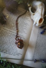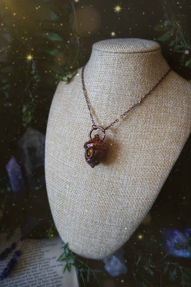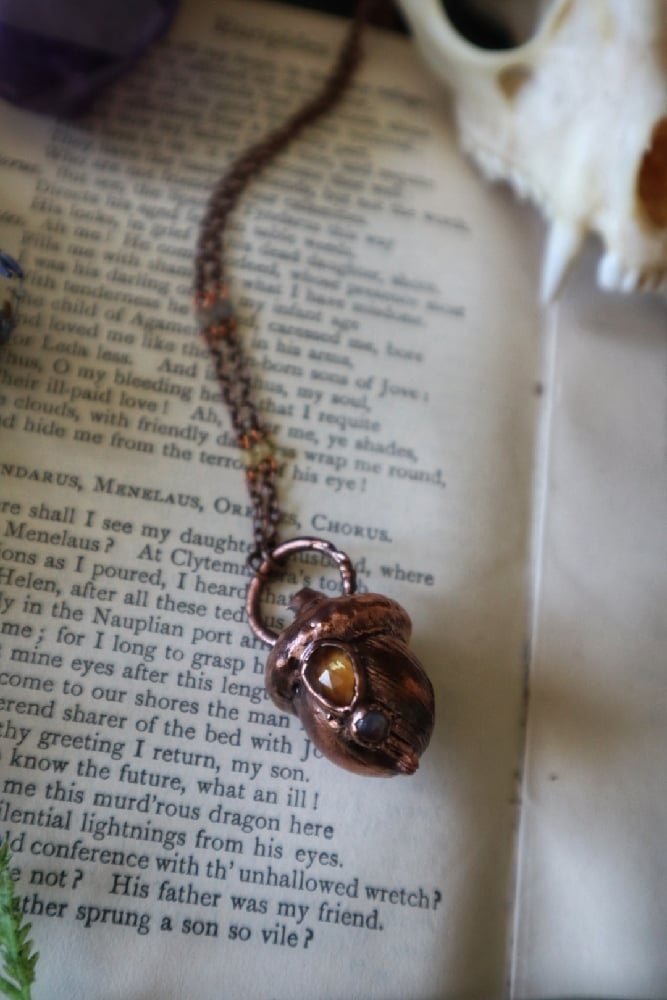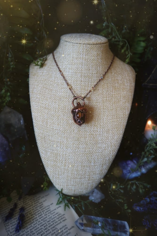 Featuring a real acorn plated in copper and adorned with a faceted citrine and rainbow moonstone gemstones