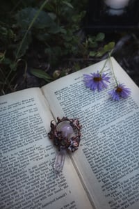 Mushroom magic is also abundant during the summer, but really peaks in spring and autumn during those transition times of the year. This adorable mushroom portal features a small rose quartz carved mushroom, with a Vera Cruz amethyst crystal at it's base. Adorned with a faceted peridot gemstone and surrounded by real copper plated ivy leaves.