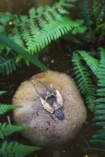 The Mini Fern Portal although small in size, does not have small energy. This little portal is all about cultivating intuitive insight, and exploring both within the self and out in the world with an open mind. This portal features a Vera Cruz amethyst topped with a glowing rainbow moonstone. Adorned with real fern leaves plated in copper and topped with a small faceted peridot gemstone.